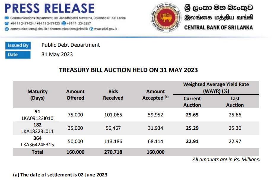 - Holding yield rates almost unchanged by the T bill Tender Board at the auction held on 31 May 2023 could be due to an insider act to facilitate bond dealers expecting a significant reduction in the yield rates from the next day due to the policy rate cut. Significant policy rate cuts were speculated from recent CB's economic comments and the last IMF staff visit's press briefing held on 16 May 2023.
